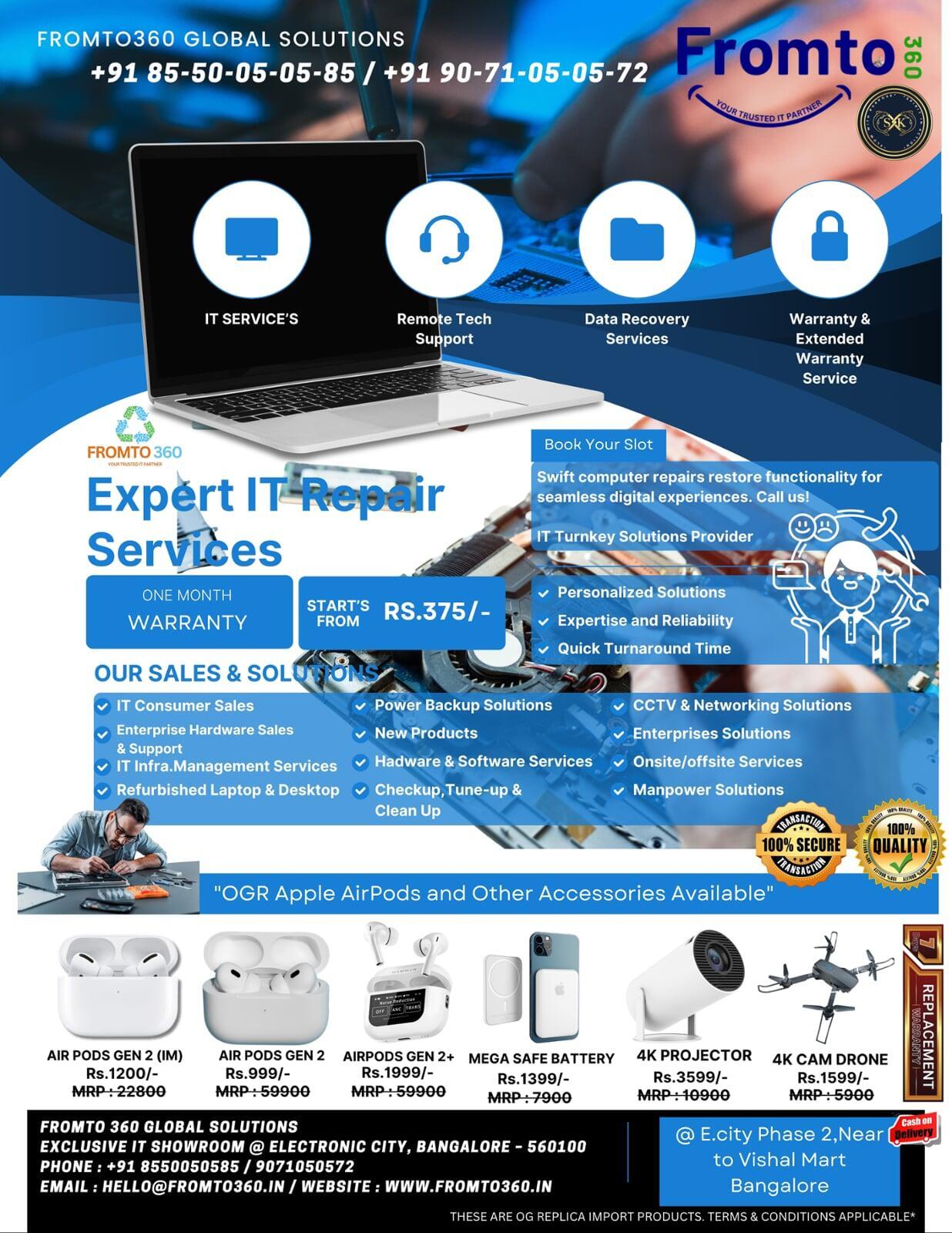 Discover the exceptional Fromto360 E-Store experience and stay updated on our exclusive service centers in Bangalore and Chennai. At Fromto360, we are committed to revolutionizing customer service, offering you the opportunity to truly Experience the Difference. Whether you are in search of the latest Apple devices, cutting-edge tech gadgets, or high-quality accessories, Fromto360 Stores has everything you need at unbeatable prices.